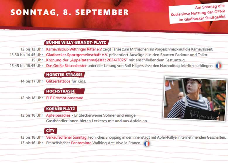 Am ersten Septemberwochenende eines jeden Jahres steht Gladbeck Kopf : zum 35. Mal wird das traditionelle Appeltatenfest in Gladbeck 2024 gefeiert mit Strassenkünstler, Pantomime und Bands. Die Tradition des Appeltatenfestes lässt sich bis ins Jahr 1403 zurückverfolgen : damals wurde dem kleinen Dorf Gladbeck das Recht zugestanden, alljährlich vor und nach dem Festtage des heiligen Bischofs Lambert, des Schutzpatron der Gladbecker Kirche, einen Jahrmarkt abzuhalten.